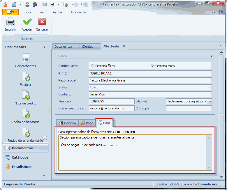 - Nota. Se incorporó una nueva pestaña para llevar a cabo la captura de anotaciones y/o comentarios relacionados con el cliente en cuestión, este nuevo campo no tiene límite en su captura.