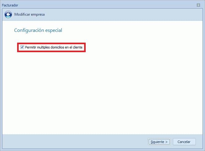 • Asistente de empresas – La funcionalidad del uso de multi domicilios para los clientes está disponible en todo momento, la forma en que puedes activarla es pulsando la secuencia de teclas Ctrl + Shift + F12, estando dentro del asistente del manejo de empresas. Una vez realizada la pulsación de la secuencia de teclas, se desplegará una penúltima ventana dentro del mismo que te permitirá habilitar el uso de ésta funcionalidad, con tan solo dar clic a la caja de selección, como se muestra en la siguiente imagen: