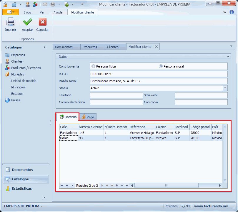 • Multi domicilios – Se modificó el facturador para permitir el manejo de más de un domicilio al momento de la captura de los datos dentro del catálogo de clientes, lo cual te permitirá la selección del domicilio de tu cliente al cual quieres llevar a cabo la generación del comprobante, esto si tu cliente maneja más de un domicilio para su facturación.