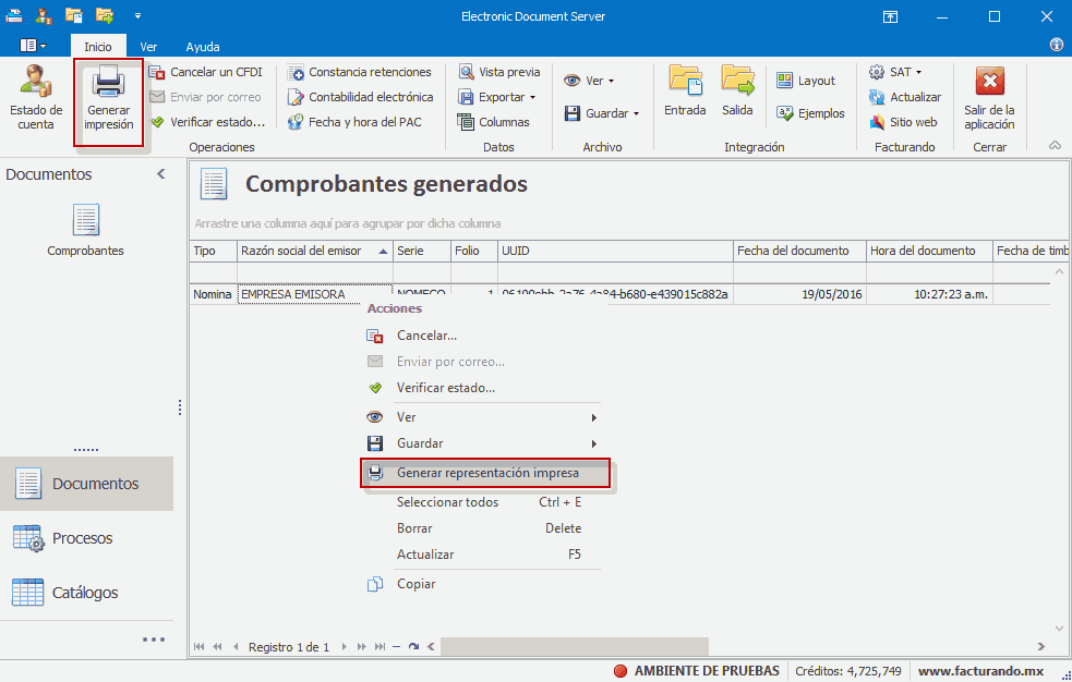 - Generar la representación impresa (PDF) de cada uno de los CFDIs descargados.