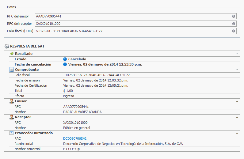 Una vez que la aplicación tenga esta información, bastará con dar clic al botón “Consultar” para que dé inicio el proceso de verificación. Al termino de éste se mostrará en pantalla la siguiente información como resultado de la respuesta del SAT: