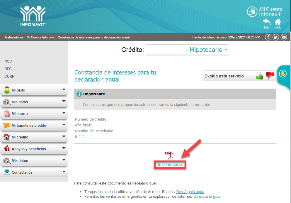 Teniendo este documento, podrás deducir, dentro de tu declaración anual, los intereses que pagaste por el crédito que tienes vigente en el INFONAVIT.